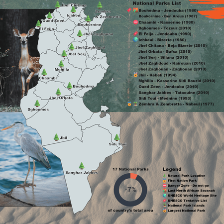 Today, Tunisia boasts 17 national parks and many nature reserves, protecting over 1 million hectares (6.3% of the country's territory). These parks are carefully distributed to safeguard every unique ecosystem Tunisia has to offer: